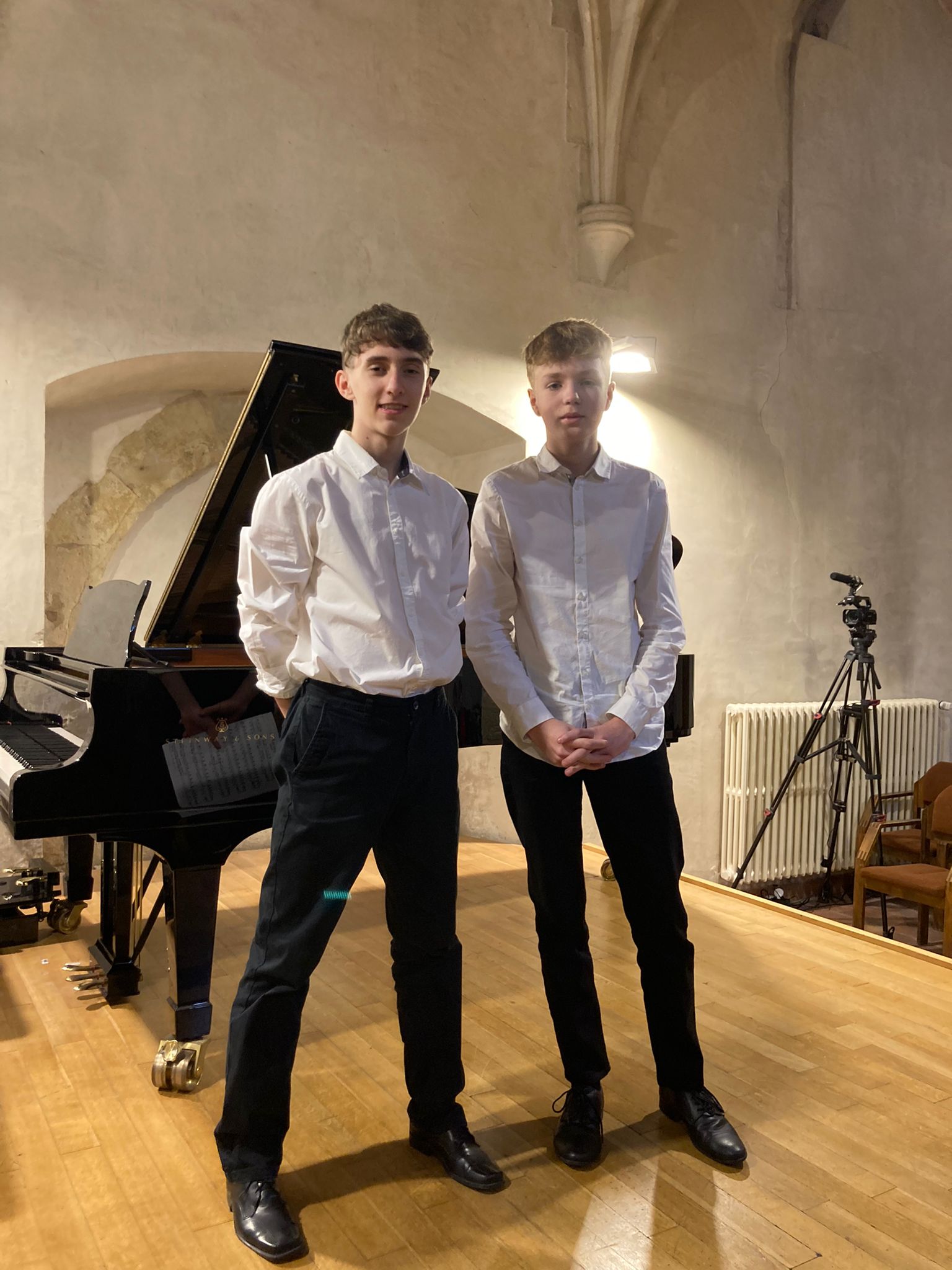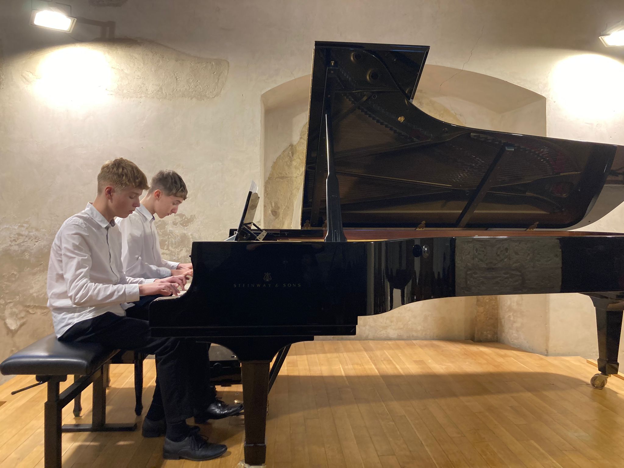 Martin Foltýn a František Chmelař z klavírní třídy Hany Čašové si čtyřručně zahráli s chutí skladbu současného českého skladatele Pavla Malého „Kovbojové na koních“ a získali další cennou pódiovou zkušenost.