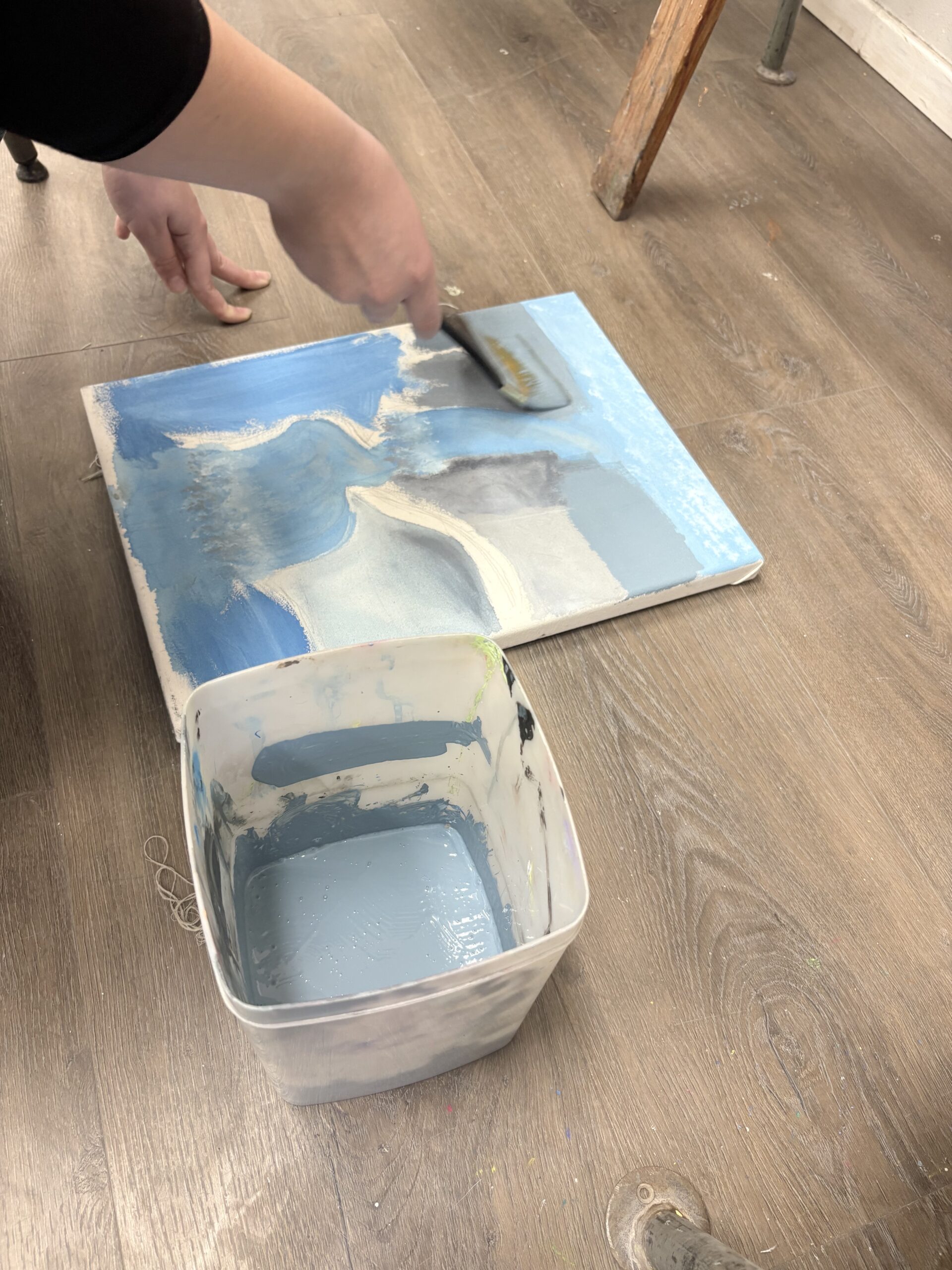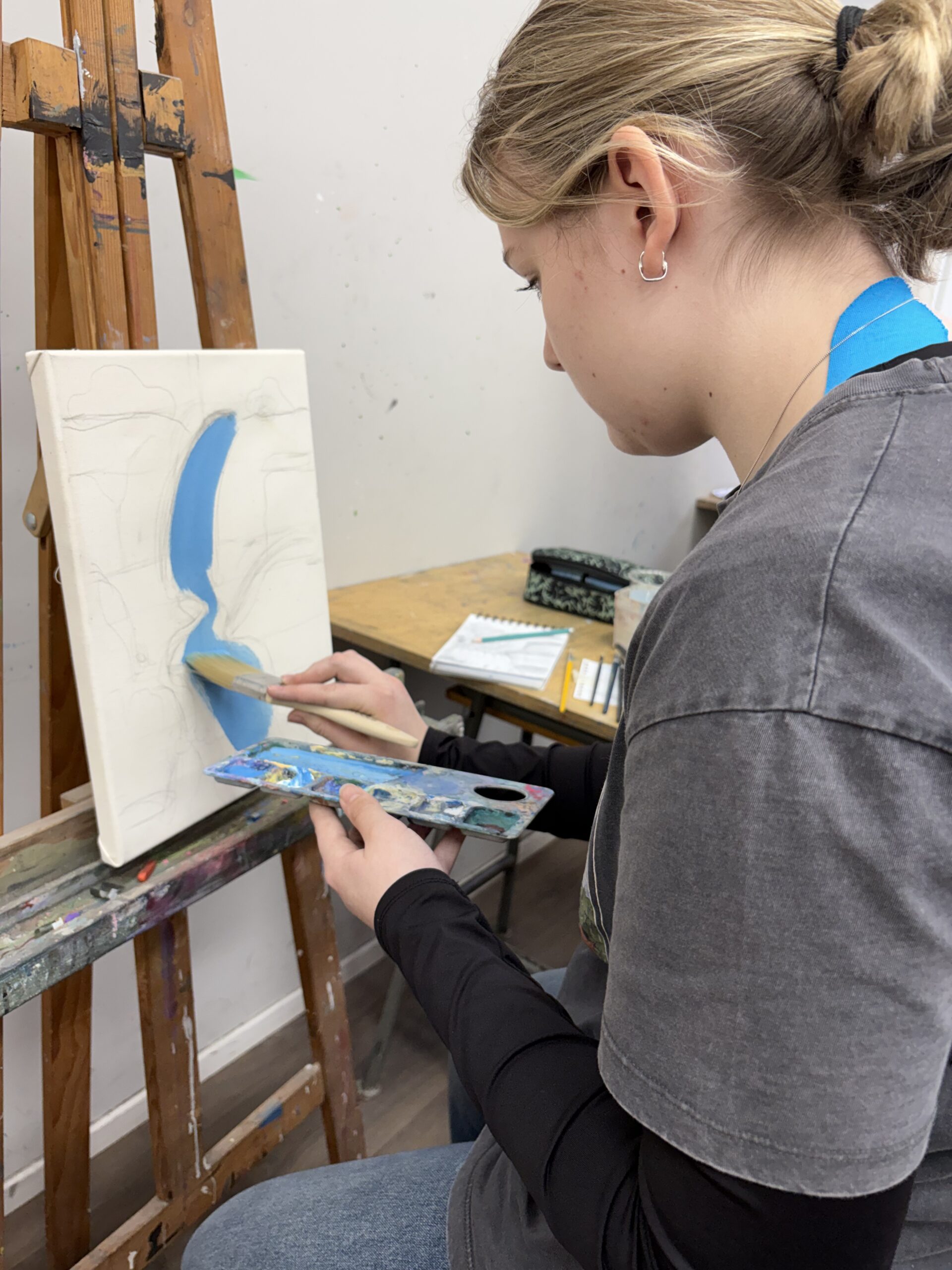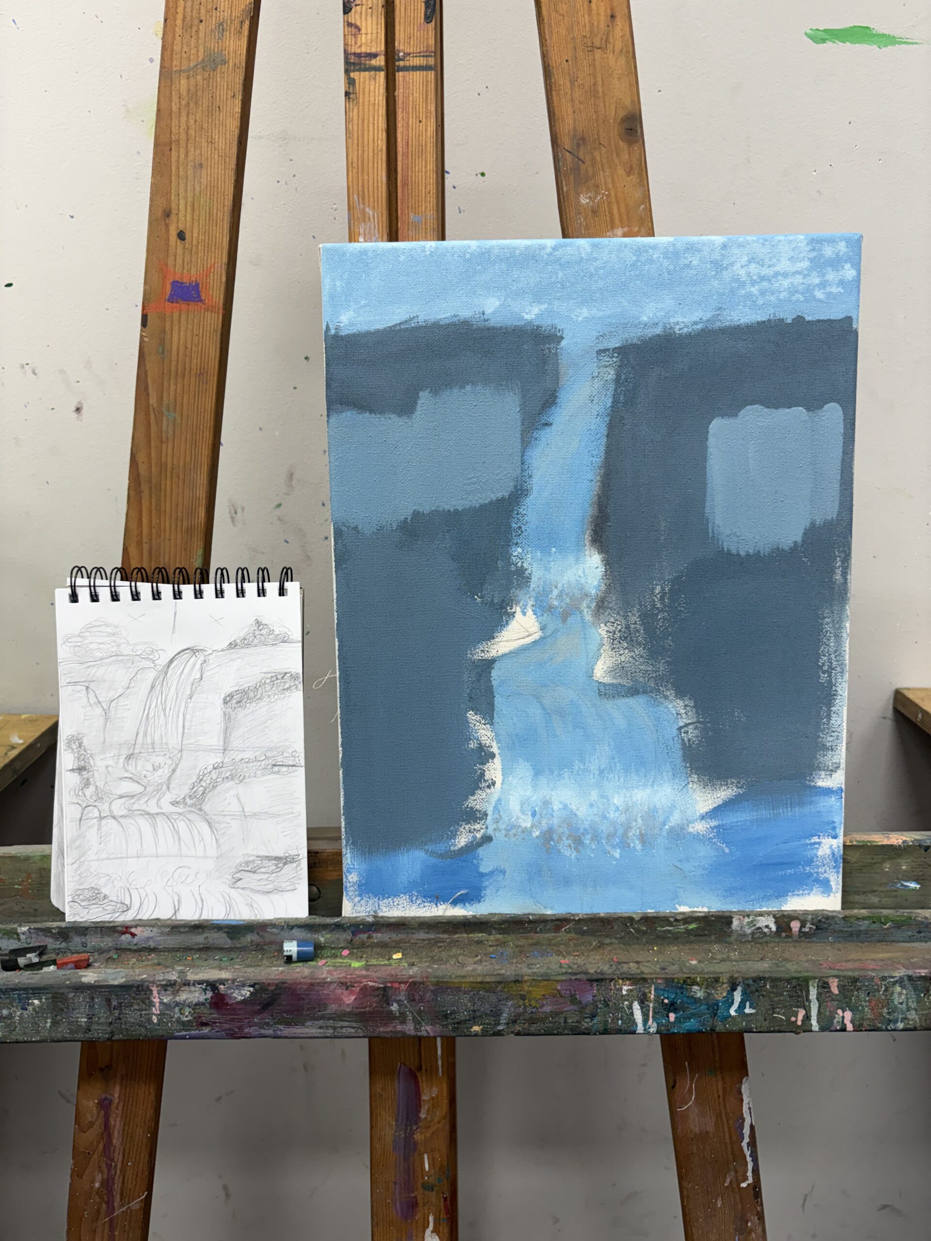 V první lekci si Magda samostatně připravila vlastní malířská plátna. Naučila se napnout plátno na rám, správně jej našepsovat a připravit tak kvalitní podklad pro další práci. Součástí domácího úkolu bylo vytvoření skic na téma krajina, umělci nebo zcela vlastního námětu. Magda si zvolila námět krajina a inspirovala se skutečnými fotografiemi krajin.