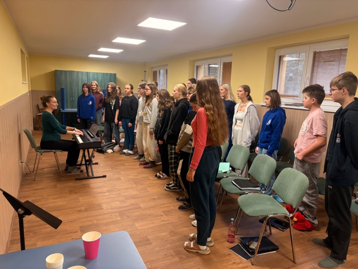 Soustředění mělo také výrazný pěvecko-dramatický přesah. V rámci výběru zpěvaček hlavního sboru jsme se připravovali na chystaný muzikál umělecké školy. Zavítala mezi nás proto vedoucí pěveckého oddělení, Mgr. Olga Bezačinská, ArtD., která dětem představila celý koncept připravovaného představení a společně s námi pracovala na pěvecké složce.