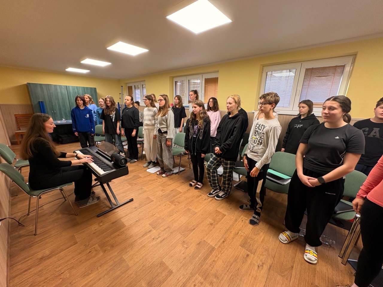 Soustředění mělo také výrazný pěvecko-dramatický přesah. V rámci výběru zpěvaček hlavního sboru jsme se připravovali na chystaný muzikál umělecké školy. Zavítala mezi nás proto vedoucí pěveckého oddělení, Mgr. Olga Bezačinská, ArtD., která dětem představila celý koncept připravovaného představení a společně s námi pracovala na pěvecké složce.