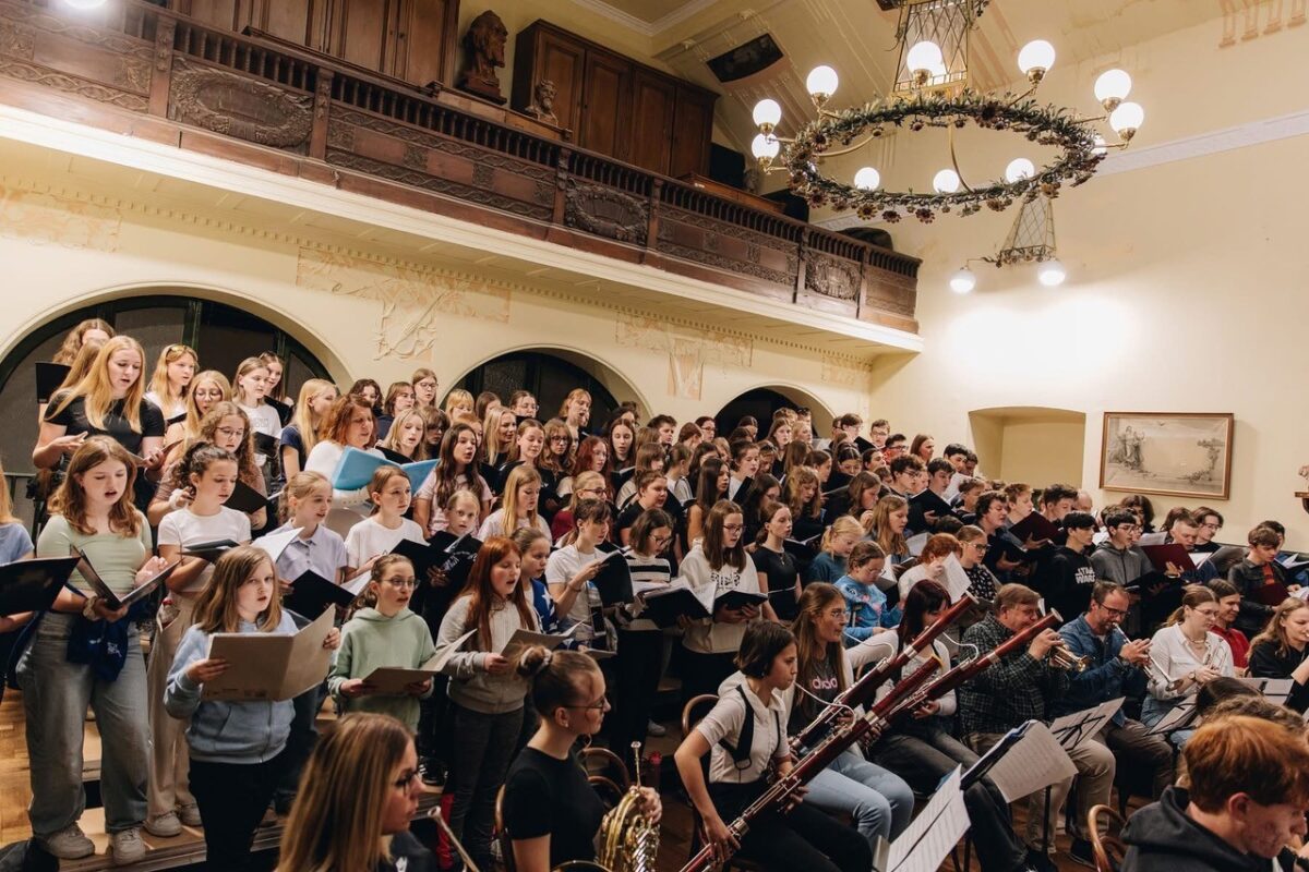Na cestu jsme se vydali v úterý ráno společně s Mužským komorním sborem Permoník a cestou se k nám připojil také olomoucký sbor Campanella. Už samotná cesta v takovéto sestavě přinesla neformální setkání, sdílení zkušeností a vytvoření přátelského prostředí mezi mladými zpěváky z různých koutů republiky. Po příjezdu do Prahy jsme se zúčastnili společné zkoušky v historickém sále Hlahol – prostoru s neopakovatelnou atmosférou, který inspiroval k soustředěnému výkonu a hudebnímu propojení s ostatními účinkujícími.