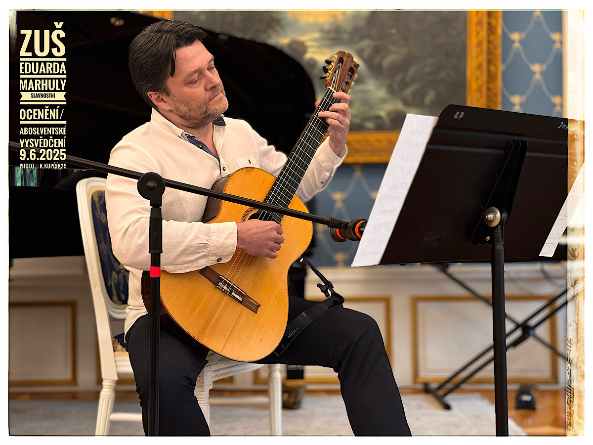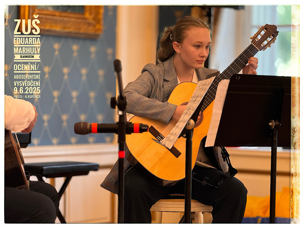 Červnový podvečer doprovodili svým vystoupením žáci hudebního oboru – Viktorie Macej si zazpívala se svým tatínkem, Martin Foltýn si zahrál se svou maminkou Radanou Foltýnovou na dva klavíry, za nejmladší hudebníky vystoupil trumpetista Václav Klos, kytaristka Bohdana Buchalová si zahrála se svým učitelem Ondřejem Gilligem a závěrečnou hudební tečkou absolventského setkání se stalo vystoupení zpěvačky Klary Vittorie Bačíkové. Všichni interpreti svými výbornými výkony podtrhli slavnostní charakter našeho tradičního závěrečného setkání.